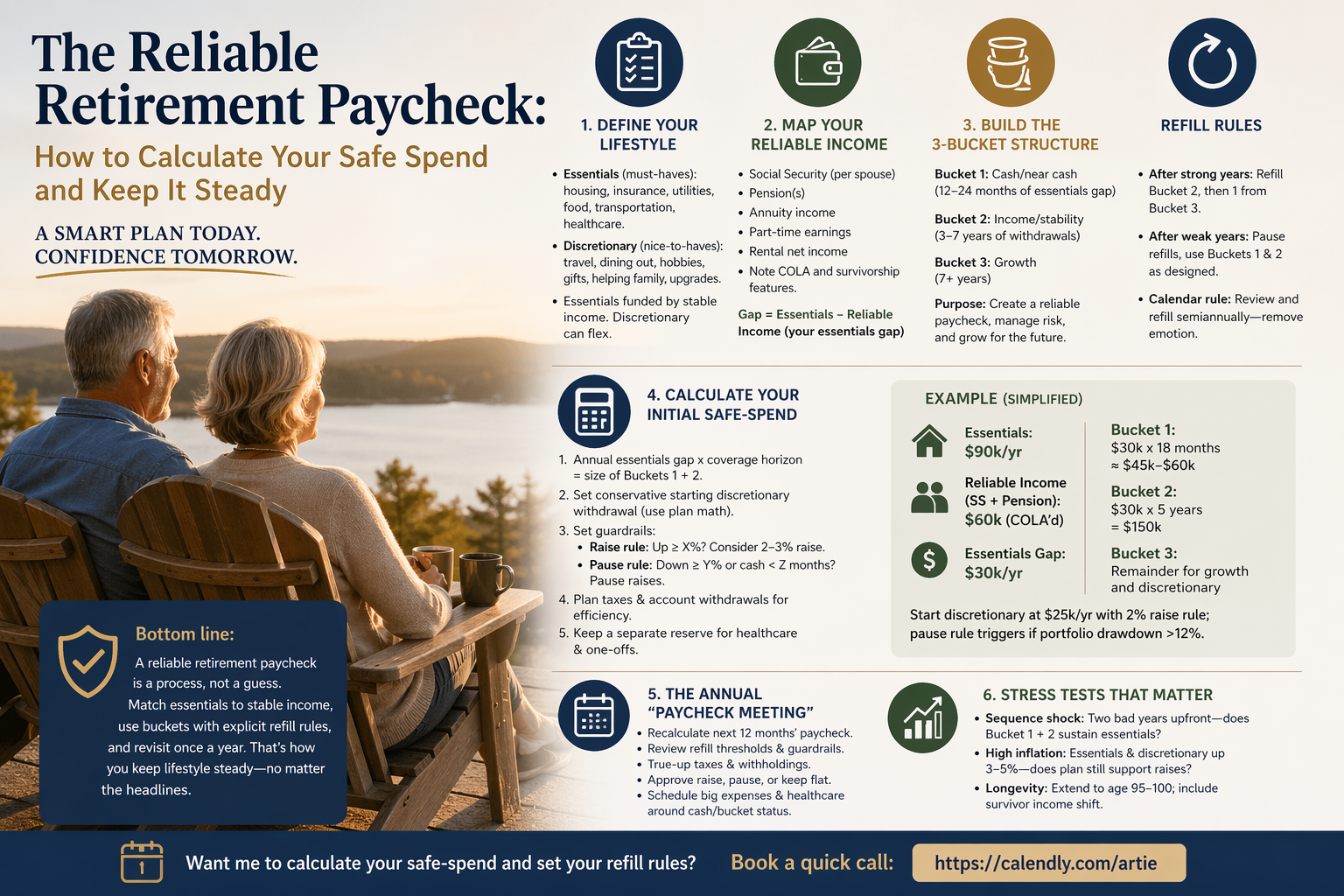 Bottom line A reliable retirement paycheck is a process, not a guess. Match essentials to stable income, use buckets with explicit refill rules, and revisit once a year. That’s how you keep lifestyle steady—no matter the headlines.